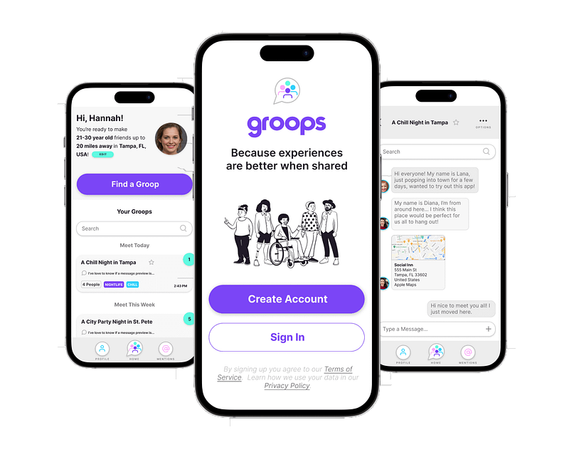 Groops needed to cater to an audience seeking connections, adventure and friendship. I wanted the UI to be simple, easy to use, and focused on the Groop chats.